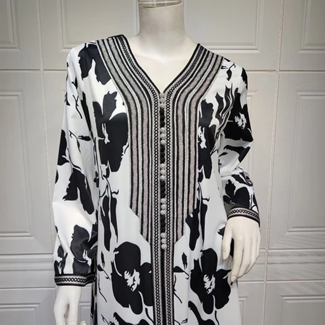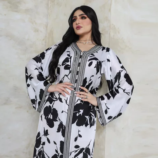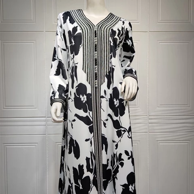 Abaya traditionnelles imprimé et brodé perles et dentelle, de couleur blanc et noir.